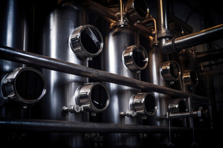 close-up of whiskey distillation equipment outdoors, created with generative ai