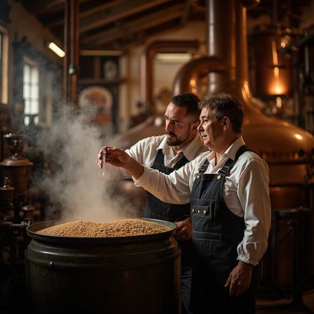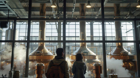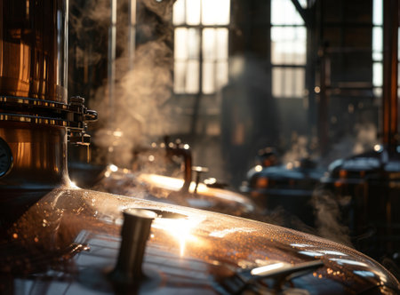 Steam rising from copper tanks during the brewing process highlights the intricate craftsmanship and technology of a brewery's production