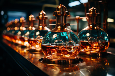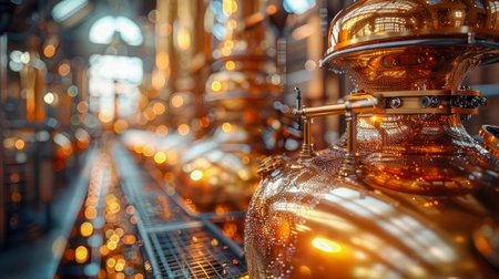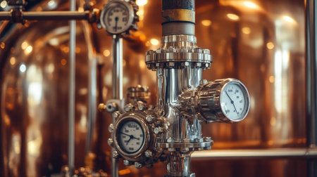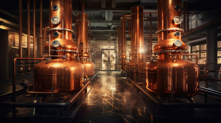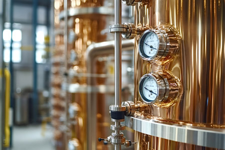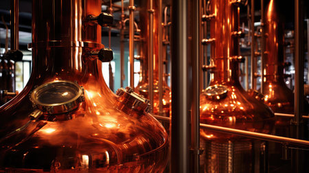 Shiny copper stills featuring pressure gauges measure alcohol production within a distillery, illustrating the intricate brewing and distilling processes in an industrial setting