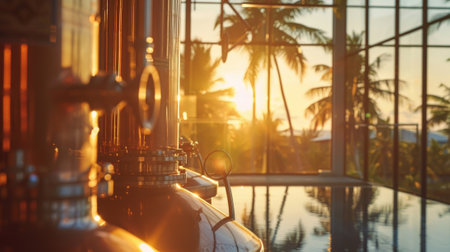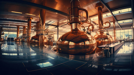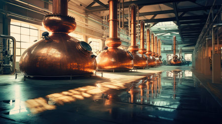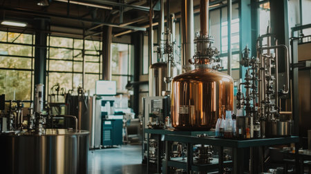 A captivating view of a modern distillery showcasing advanced equipment and copper machinery, filled with natural light, creating an innovative atmosphere for beverage production.