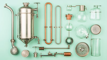 This image showcases a creative arrangement of vintage laboratory equipment and glassware on a soft mint background, perfect for inspiring scientific exploration and creativity.