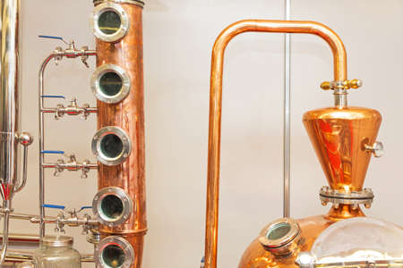 close up shining copper tanks for beer brewing with a blurred background and copy space. High quality photo