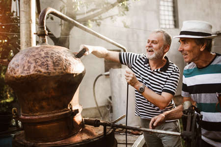 The process of making a strong alcoholic beverage at home. Copper alembic.