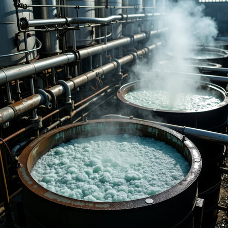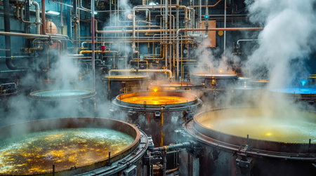 Industrial metal processing. Large vats with bubbling green liquid in a metal processing plant, with steam rising and complex piping in the background.