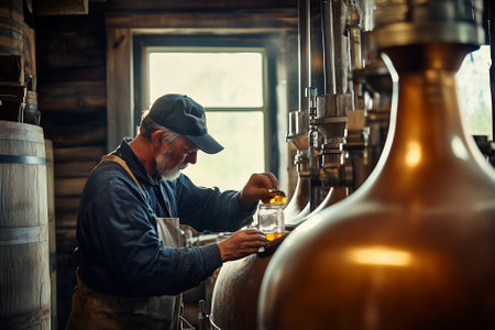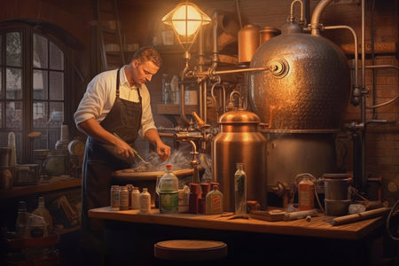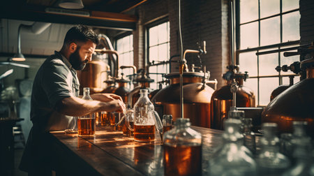 Brew-master is meticulously crafting delicious beer in a cozy, rustic distillery filled with warmth. Generative AI
