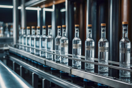 A row of vodka bottles on a conveyor belt at a factory. Efficient modern conveyor for filling vodka into glass bottles on a blurred background