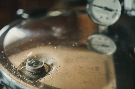 Alcohol mashine in a village courtyard, on a blurred background. Preparation of an intoxicating beverage. Close-up.