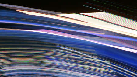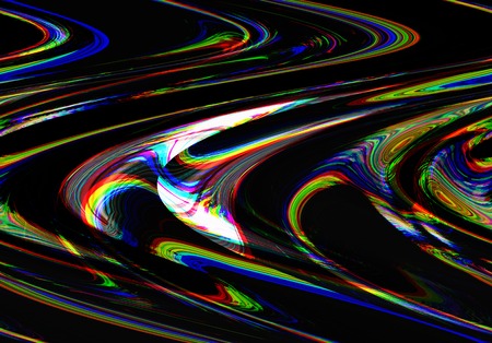 Signal distortion. Vhs glitch. Light glow background. Neon rainbow and white flare blurred twisted lines noise texture on black.