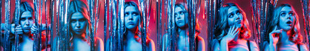 Festive collage. Female expression. Party fail. Pretty woman showing sad gloomy puzzled disappointed guessed emotion in cascade curtain decor blue red neon light wide ledge.