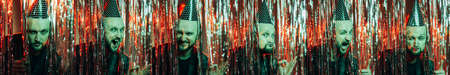 Party collage. Drunk man. Face expression. Holiday joy. Ridiculous guy in festive horn hat playing tricks making grimace on shimmering red cascade curtain decoration wide ledge.