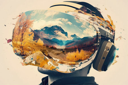 panoramic virtual reality vr headset double exposure image, created with generative ai