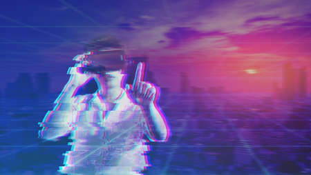 Man wearing virtual reality headset. Evolution concept of virtual reality, games, entertainment and communication. Image in modern neon color gamma. Image with glitch effect