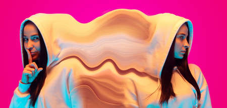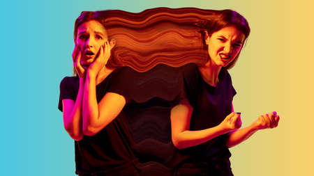 Mental health concept in creative way. Woman with different emotions connected by colorful wave. Splitting personality, displayed and hidden feelings. Happe, cheerful and disappointed, depressed.