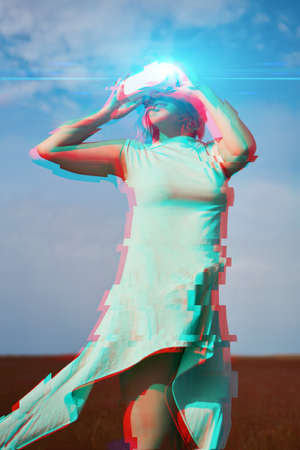 Woman goes into virtual reality using virtual reality headset. Image with glitch effect.