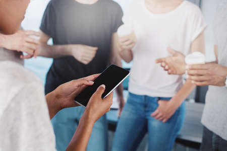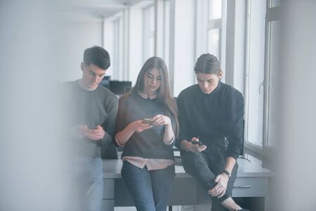 With smartphones in hands. Group of young people in casual clothes have a rest in the modern office.