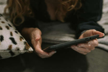 Cropped shot of a girl holding smartphone while sitting cross legged in living room