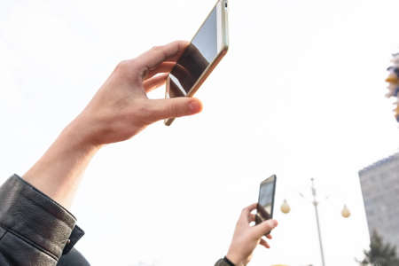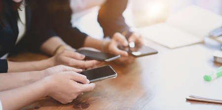 Group Of Young People Using Smart Phones, Close Up Of Human Hands Holding Mobile Phones While Sitting At Office Table Near Window, Side View