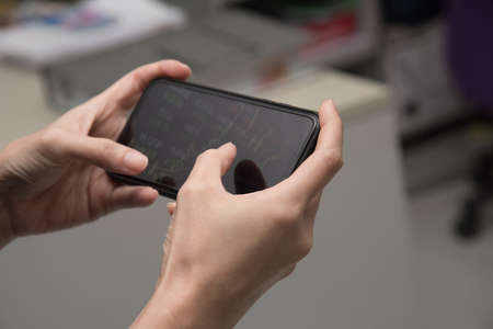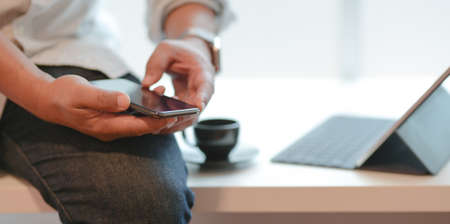 Cropped shot of businessman holding smartphone white sitting on the table in his office room