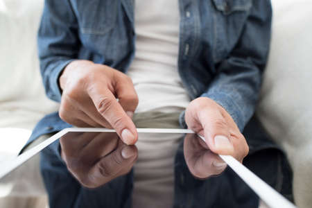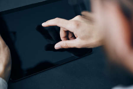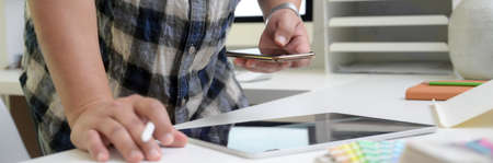 Cropped shot of male designer standing and working on digital tablet and smartphone on white table with designer supplies
