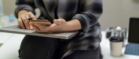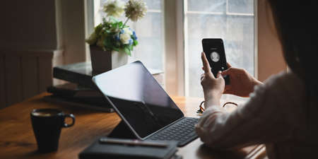 Close-up view of female freelancers sharing information on smartphone to other team members