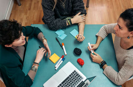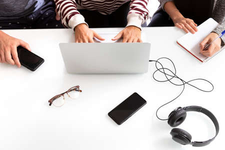 young creators and entrepreneurs creating a project. Young people working at a white desk with a computer, a phone and a notebook.