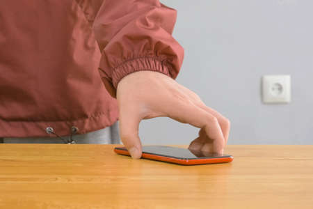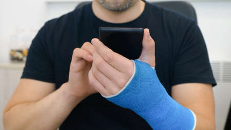 Unrecognizable bearded middle-aged man in black t-shirt with broken wrist surfs the internet at home. Male hand, wrapped in a plaster cast, uses a touchscreen on a mobile phone