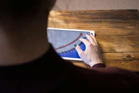 The girl working with a tablet computer. The graph rises. Table, wooden, background black