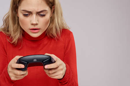 Woman with gamepad in hands playing games emotions lifestyle leisure red shirt light background
