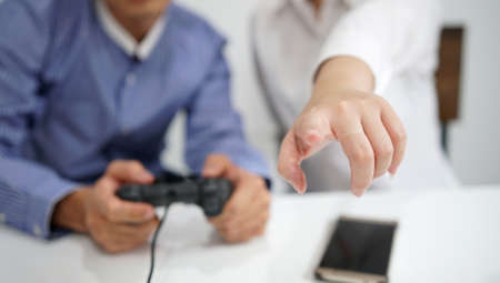 gamer boy with hand holding the joystick controller electronic for playing game with online network connection technology device in esport tournament challenge concept