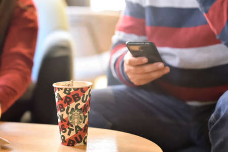 PENANG, MALAYSIA - AUG 07, 2019: Female hand holding a Starbucks coffee cup and using smartphone indoor. Starbucks is the world's largest coffee house with over 20,000 stores in 61 countries.