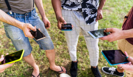 group of multiracial friends in a public park outdoors using smartphones to sharing content on social networks