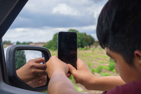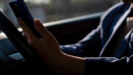 Simulated picture of the driver's hand using a smart phone, black screen inside the car, locating through a near-distance GPS navigation application, parked on the side of the road.