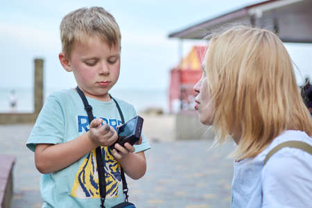 Gribovka, Odessa region - June 26, 2018: two boys met and played on vacation.