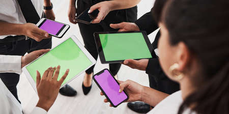 Technology keeps us updated with it all. Closeup shot of a group of unrecognisable businesspeople using digital devices together in an office.