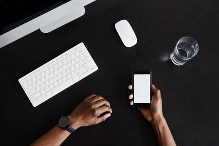 Minimal top view background of male hands holding smartphone with blank screen at black desk, copy space