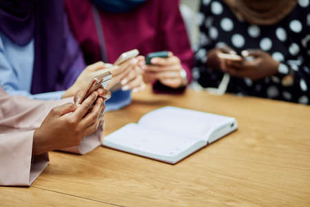 Muslim multiethnic group girls looking at smartphones in hands, sitting at table with book, close up