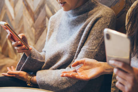 Two young woman with cell phones in hands are discussing work and new tasks together. Close-up of smartphone in female hands, meeting of two friends while sitting at the table in cafe. Selective focus
