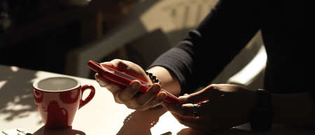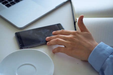 Close up view of male hands using smartphone on the table with coffee mug