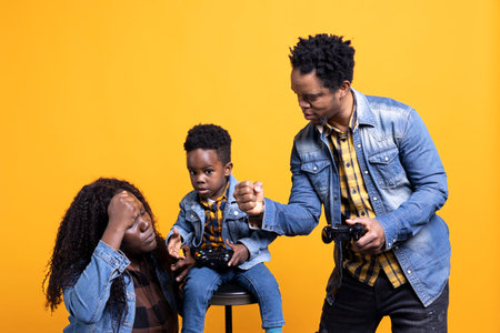 Enthusiastic father playing online video games with his baby boy using controller, both parents enjoying leisure time with their small kid. African american happy family play with a joystick.