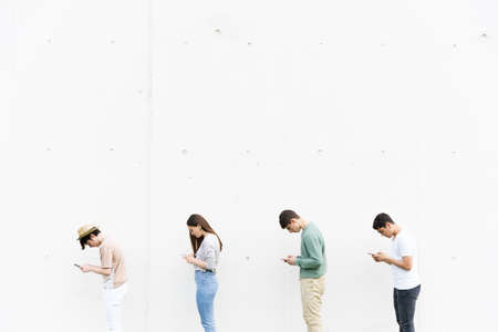 Queue of teenagers using their phones in bad posture. Lordosis and kyphosis on young people concept.