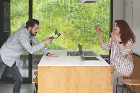 Side view of couple recording video presentation at smartphone and steadycam