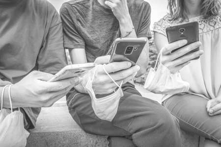 Black and white close up moment of three person in casual colorful clothes sitting and browsing their phones with masks in their hands. Social media and interacting lifestyle during pandemicin 2020