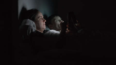 Side View of Young Couple Using Smartphones while Lying in Bed at Night, News and Social Media Addiction