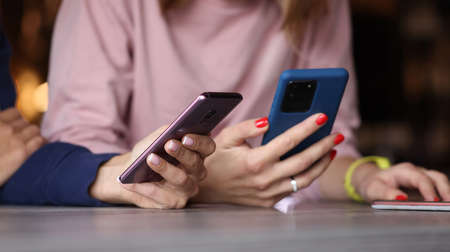 Young women friends are sitting at table with mobile phones in hands close-up. Telephone addiction nomophobia concept.