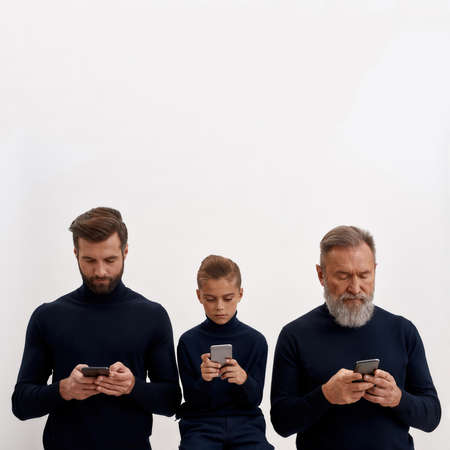 Three generations of men use cellphone devices