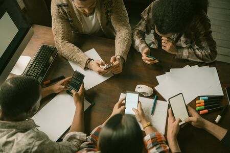 Teamwork Of Creative People In Coworking Space, Five Young Freelancers Chatting On Their Smart Phones While Sitting At Table Together, Mobile Business Meeting, High Angle View