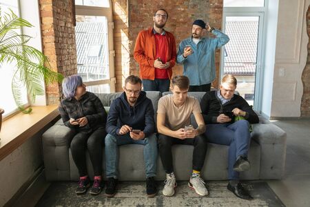 Group of happy young caucasian people sitting on a sofa together. Sharing a news, photos or videos from smartphones, reading articles or playing games and having fun. Social media, modern technologies.