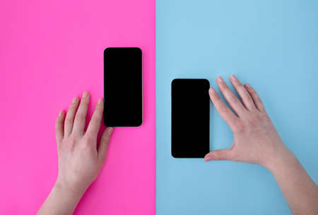 Female hands touching two smartphones with blank screens on blue and pink backgrounds, top view, flat lay