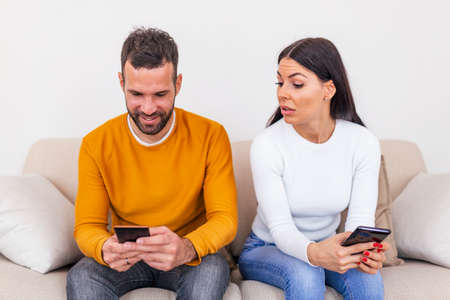 Jealous young woman with smartphone looking at smiling boyfriend using smartphone at home, relationship problem concept. Mistrust concept