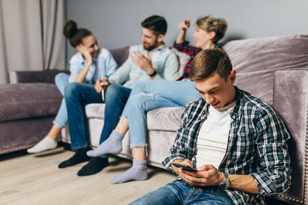 youny pleasant man in checked T-shirt is using his mobile phone while his friends are having fun. odd man in the company